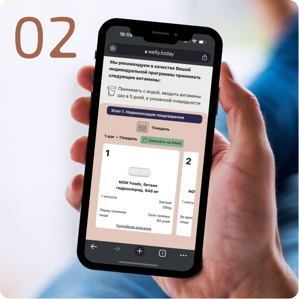 К теме витаминов и минералов я начала присматриваться давно, но мне не хотелось следовать рекомендациям «для всех», так как кажется, что это просто маркетинг и навязывание каких-то конкретных витаминов или поливитаминных комплексов, которые не работают. Я поняла, что мне нужен просто эксперт-нутрициолог, который изучит мои запросы, жалобы и даст конкретные рекомендации: где и что купить, сколько пить, почему именно это. Стала искать, нашла сервис Welly. Рекомендации составлены вместе с нутрициологами, то есть не надо выискивать своего специалиста. За меня всё уже сделали, очень удобно!